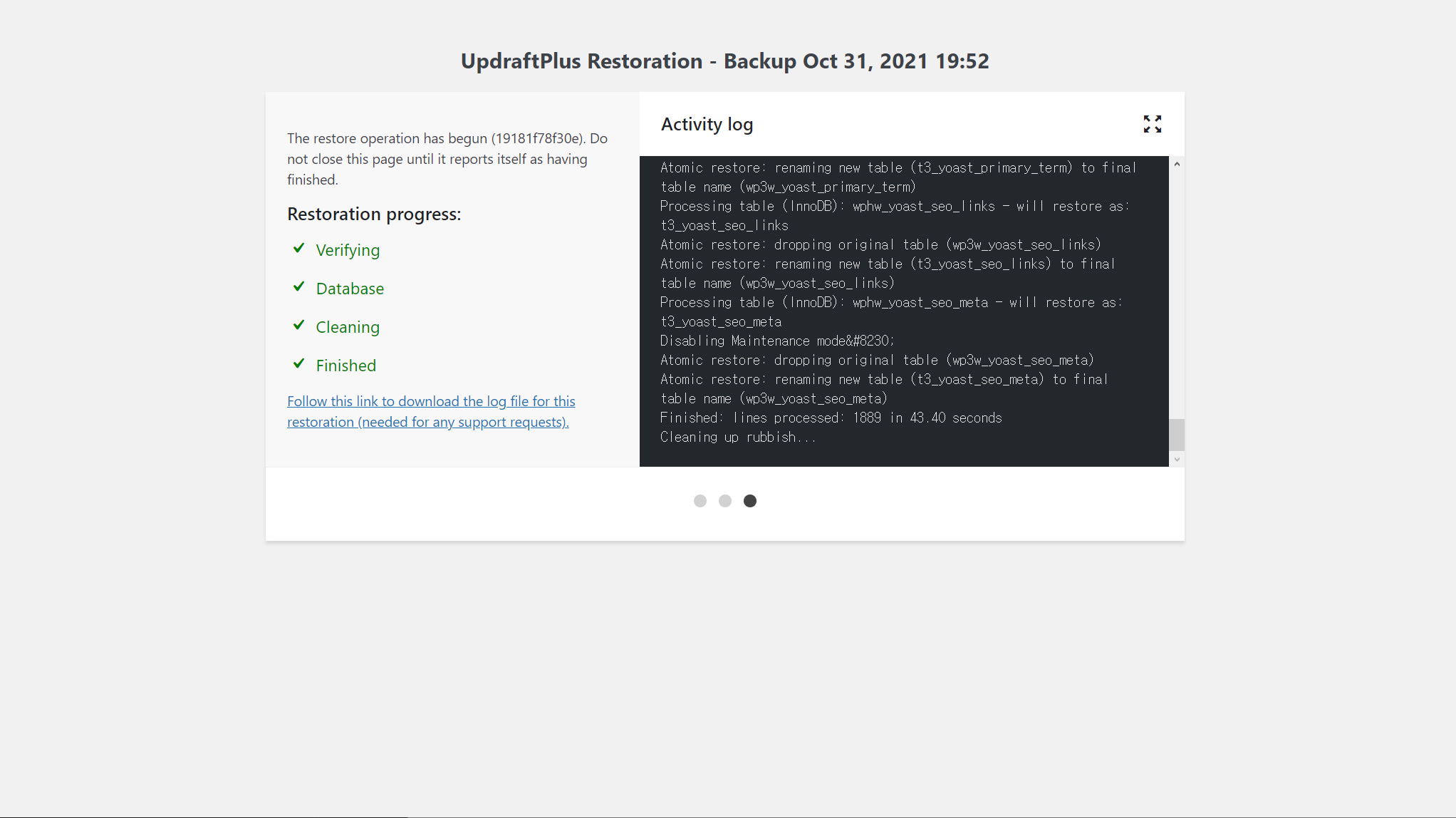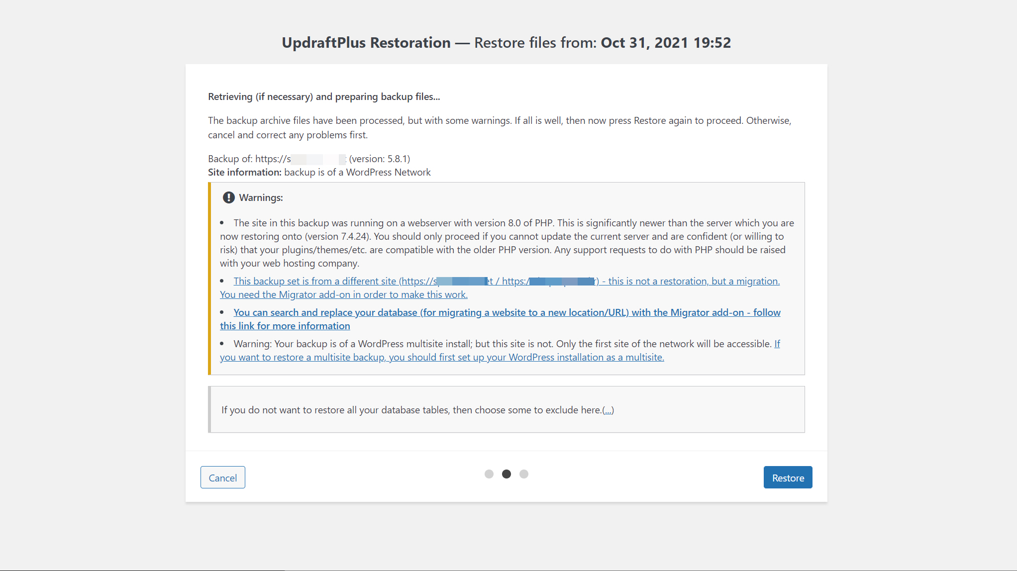 백업본의 도메인 주소와 복원하려는 사이트의 도메인 주소가 다르지만 복원이 완료되었습니다.ㅎ