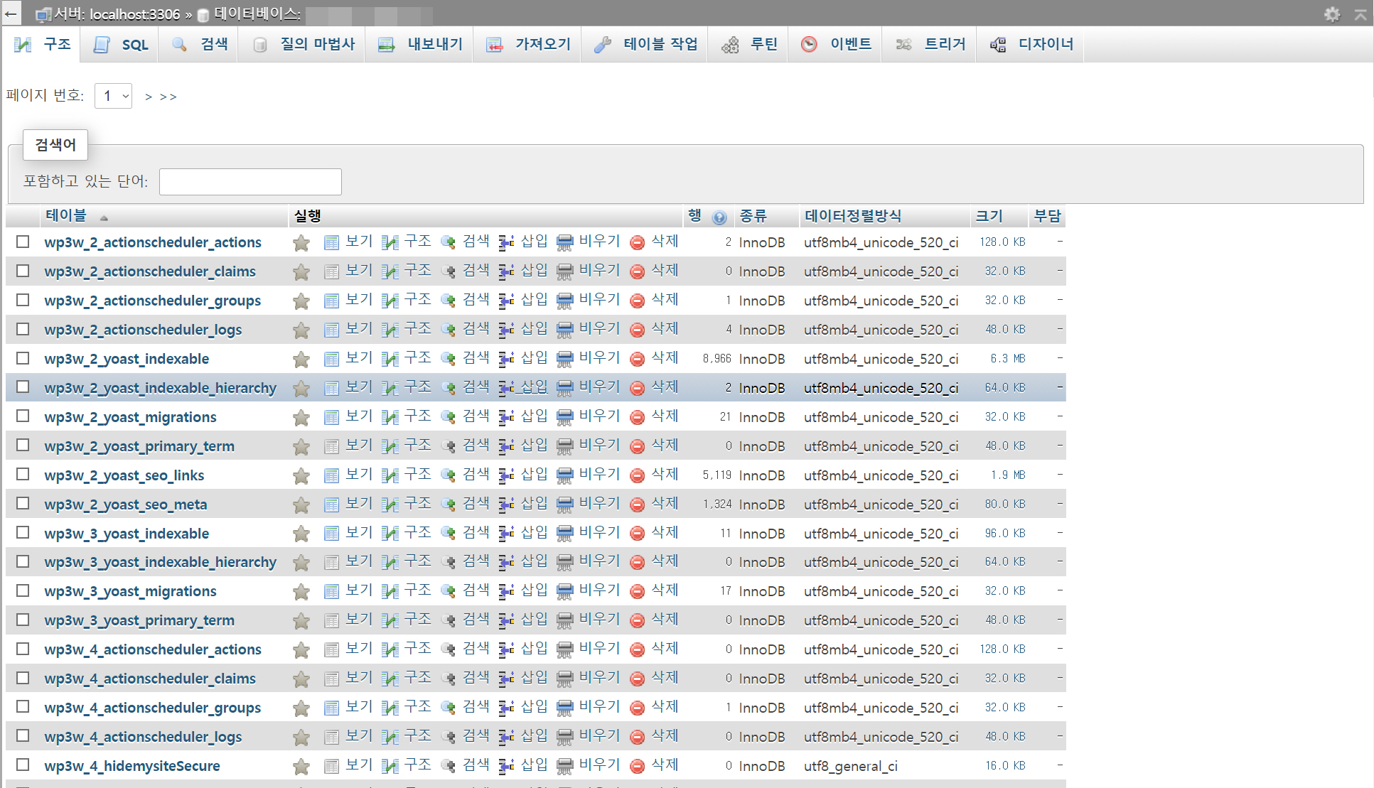 그러나 phpMyAdmin을 살펴보니 멀티사이트 내의 단일 사이트가 복원된 것이 아니고 멀티사이트의 전체 DB로 대체되어 있네요.