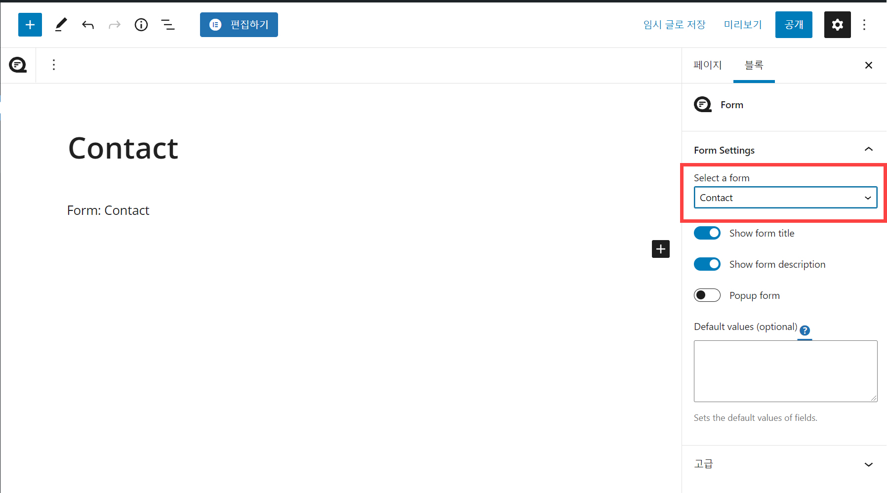 Quform 블록을 원하는 곳에 끌어다 놓는 방식으로 추가한 후에 오른쪽의 블록 속성에서 표시할 문의폼을 선택할 수 있습니다. Select a form(폼 선택) 아래의 드롭다운 메뉴에서 문의폼을 지정합니다.