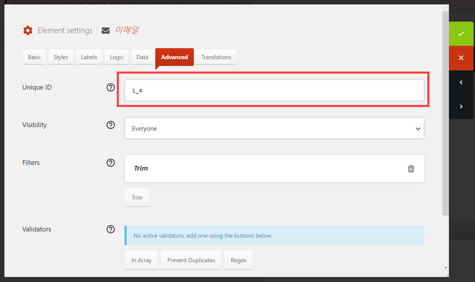 이메일 필드와 이메일 확인 필드의 설정 아이콘(톱니바퀴 모양 아이콘)을 클릭하여 Unique ID(고유 ID)를 확인하여 메모하도록 합니다.