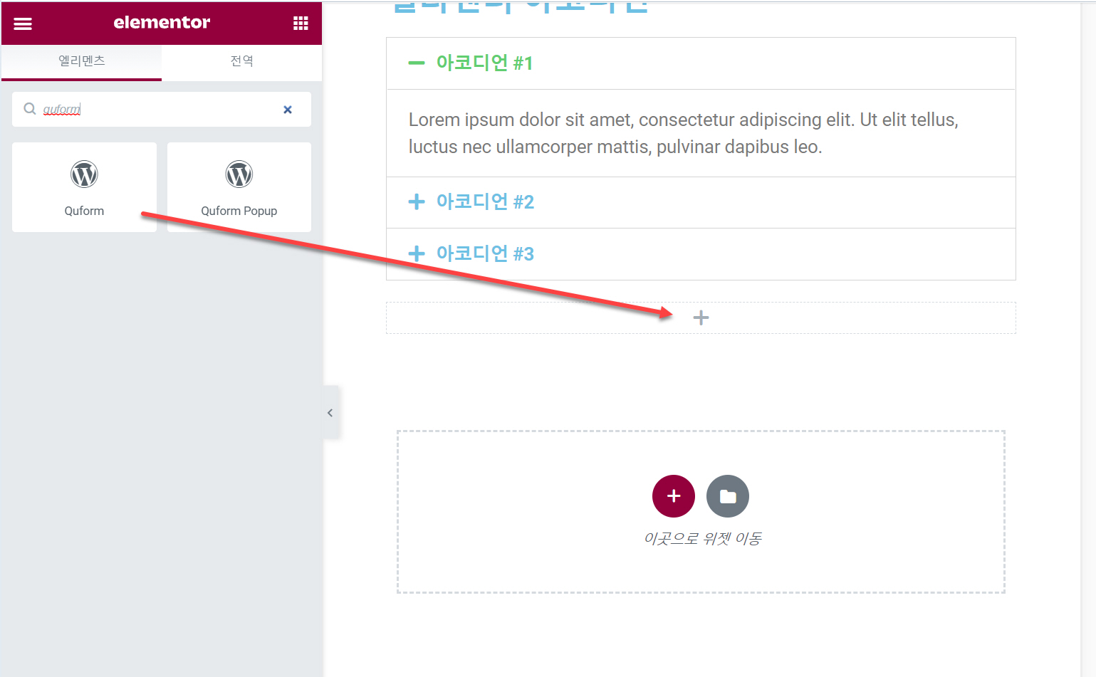 엘리멘터 페이지 빌더를 사용하는 경우에도 Quform 위젯을 적당한 위치로 끌어다 놓습니다.