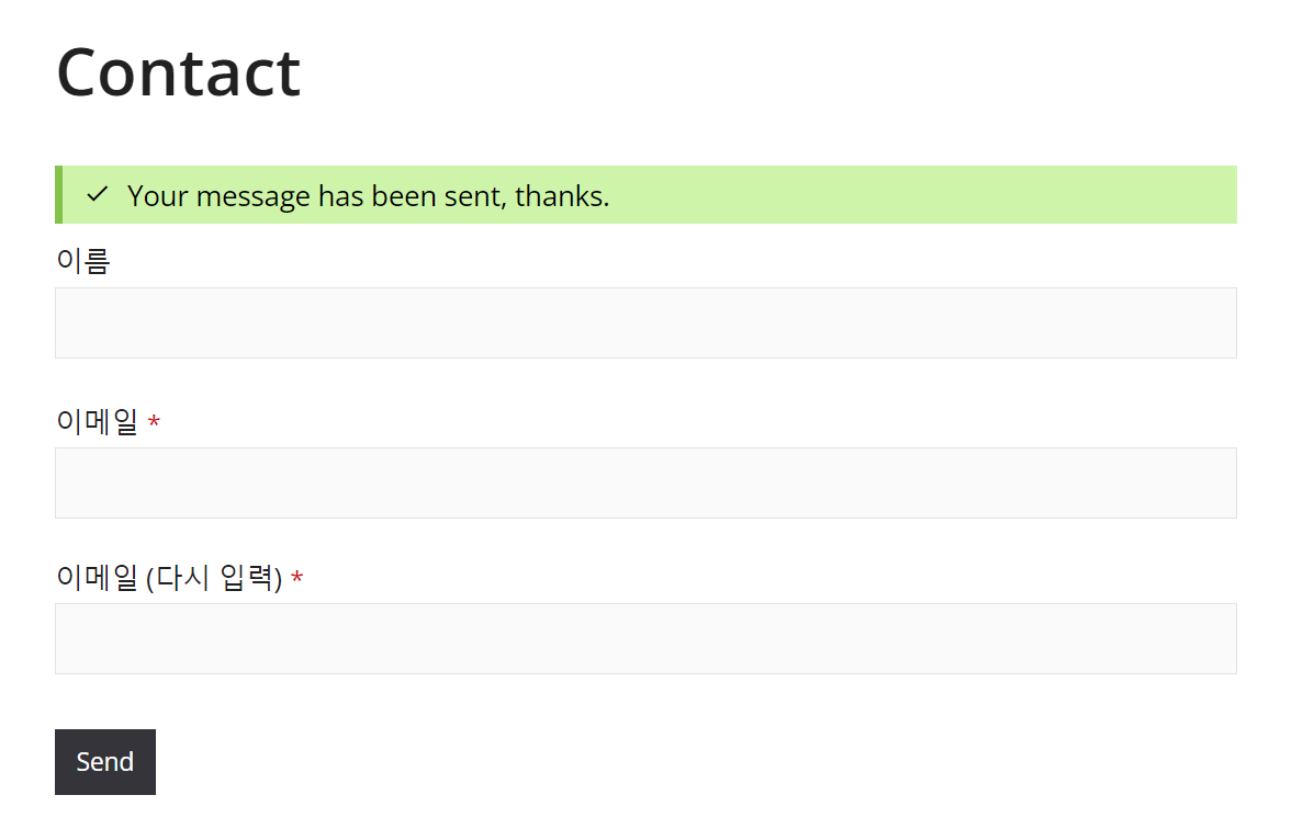 양식이 올바르게 제출되면 "Your message has been sent, thanks"(메시지가 전송되었습니다. 감사합니다.) 문구가 상단에 표시됩니다.