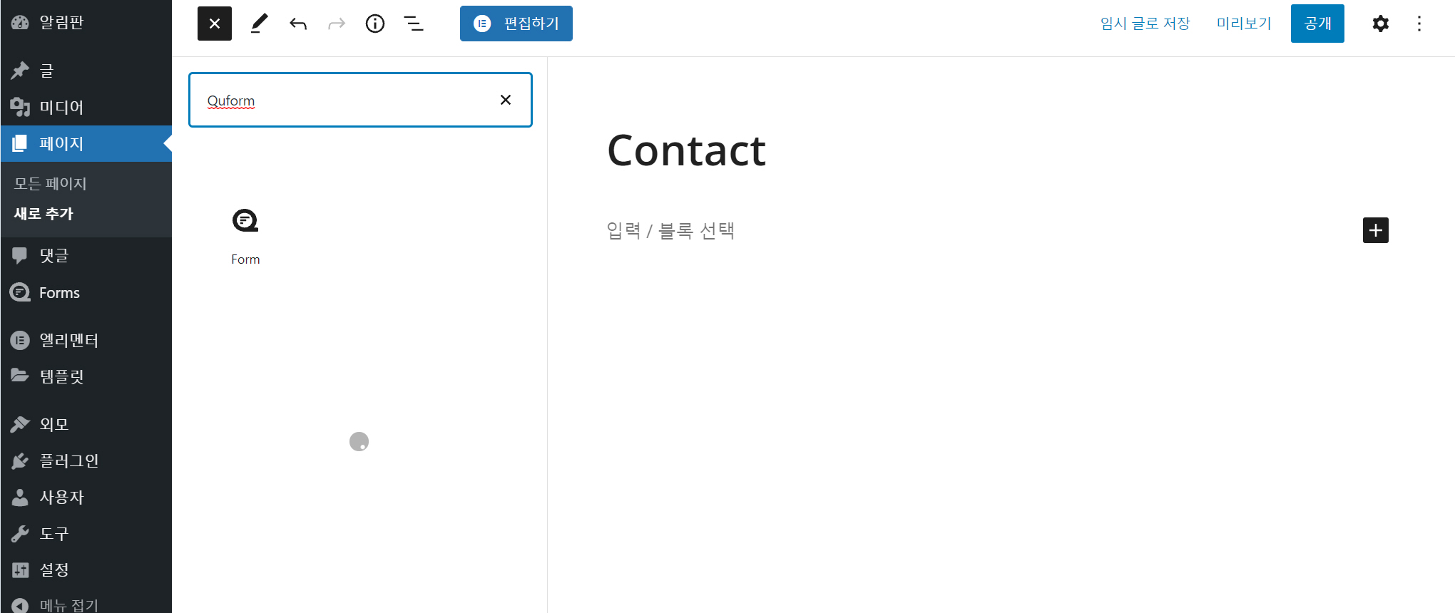 워드프레스 기본 편집기인 구텐베르크(Gutenberg)를 사용하는 경우 Quform 블록을 이용할 수 있습니다.