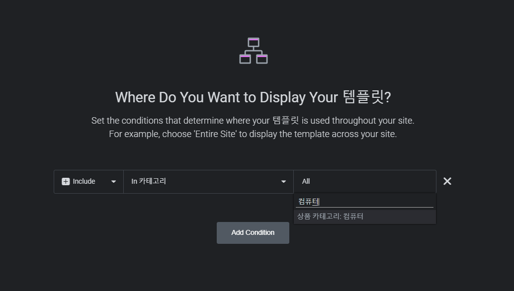 Where Do You Want to Display Your Template?(템플릿을 어디에 표시하기를 원하시나요?)가 표시됩니다. Add Condition(조건 추가) 버튼을 클릭합니다. 조건은 추후에 다시 변경이 가능합니다.