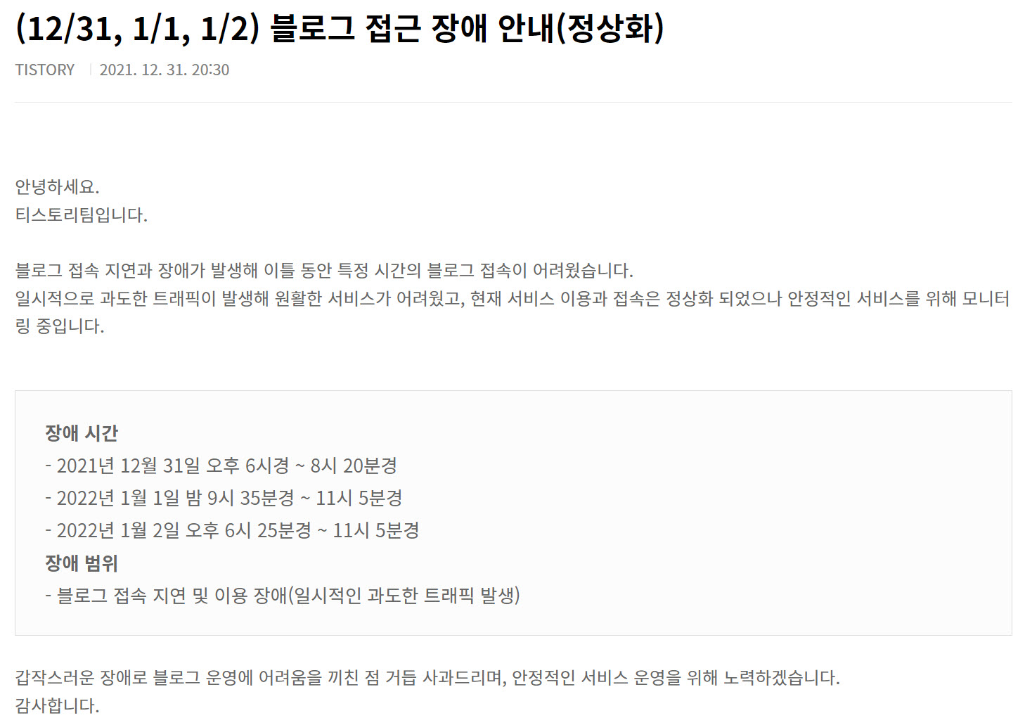이와 관련하여 티스토리 운영자는 공지를 통해 블로그 접근 장애가 정상화되었음을 공지했습니다.