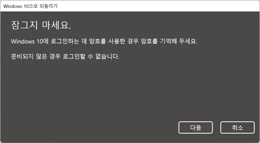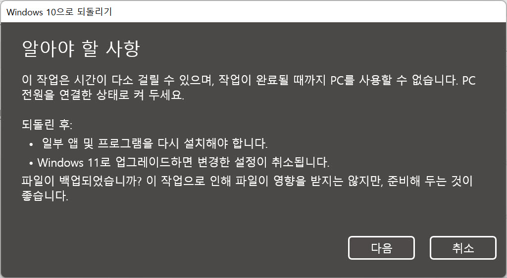 윈도우 11에서 윈도우 10으로 되돌리기