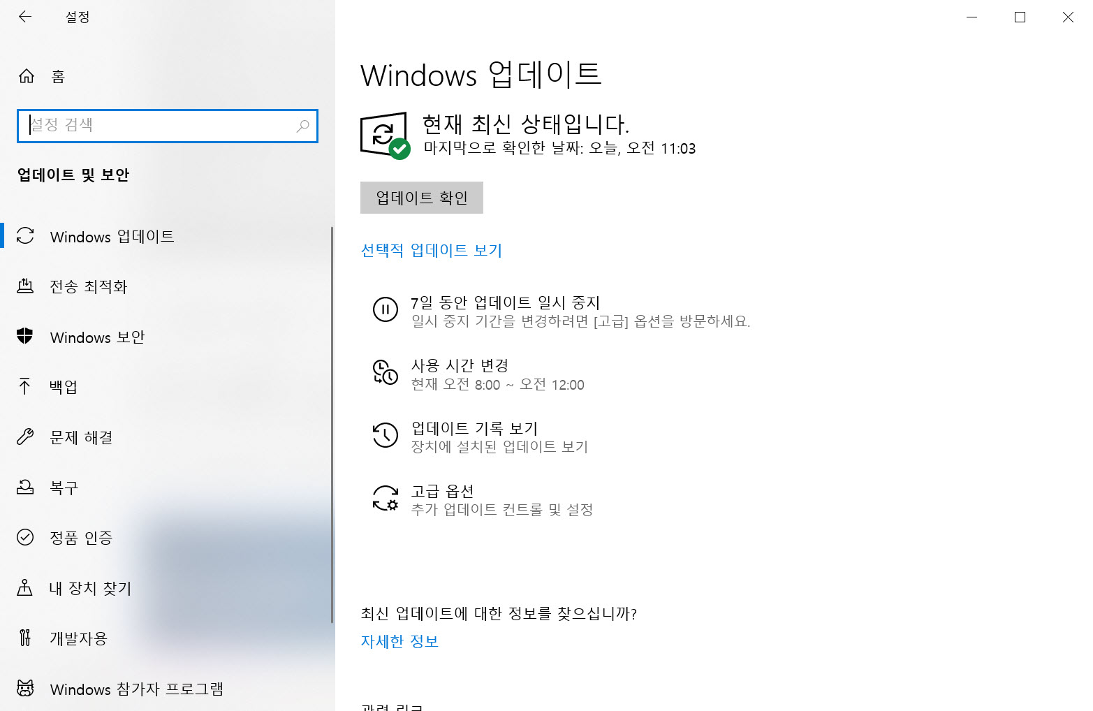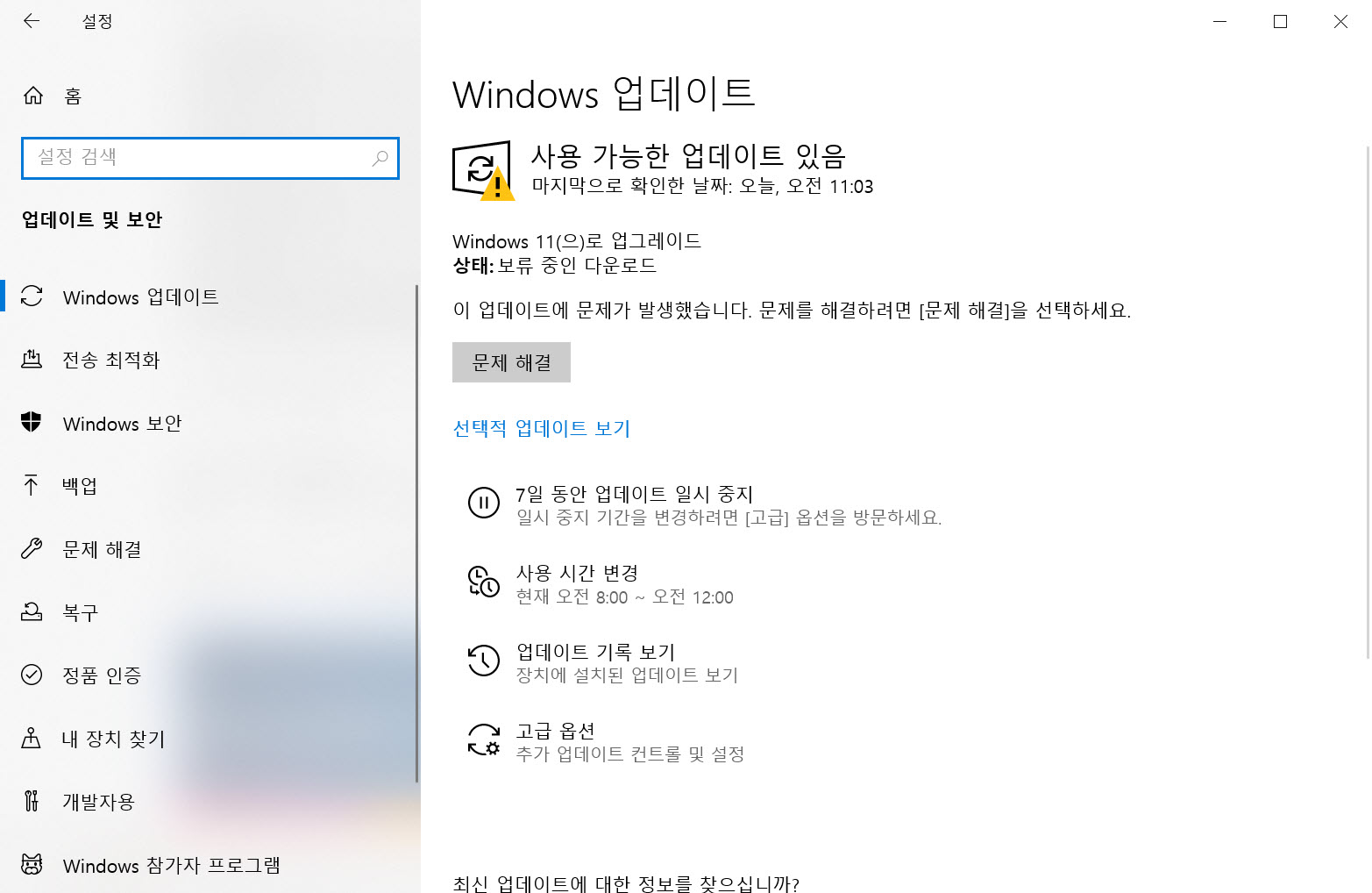 윈도우 10으로 되돌리더라도 설정의 업데이트 및 보안에서 업데이트 확인을 클릭하면 다시 윈도우 11 설치 파일을 다운로드하여 설치를 시도합니다.