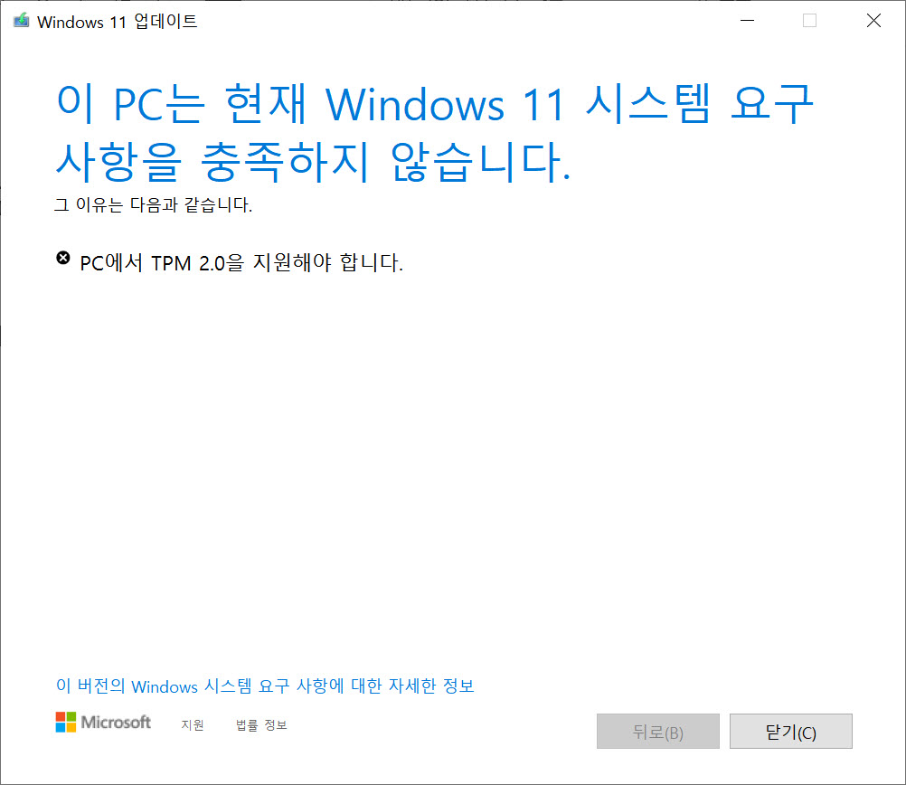 이렇게 하니 윈도우 업데이트에서 윈도우 11 설치 파일을 다운로드하여 설치를 시도할 때 "이 PC는 현재 Windows 11 시스템 요구 사항을 충족하지 않습니다" 경고가 표시되면서 설치가 되지 않았습니다.