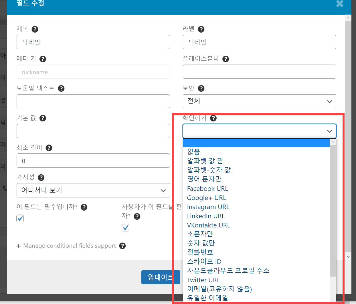 이 필드를 필수로 지정하고 싶은 경우 이 필드는 필수입니까? 옵션을 체크합니다. 그리고 사용자가 이 필드를 편집할 수 있습니까?를 체크하면(기본적으로 선택되어 있음), 프로필 페이지에서 사용자가 이 필드를 수정할 수 있습니다.