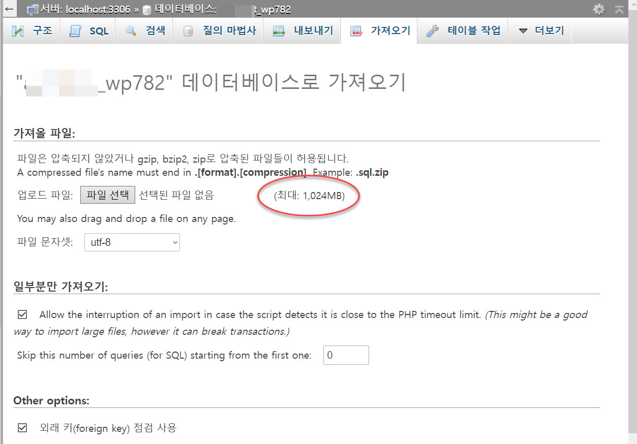 참고로 저는 DB 가져오기 탭을 설펴보니 최대 1,024MB까지 업로드가 가능한 것으로 나오네요.
