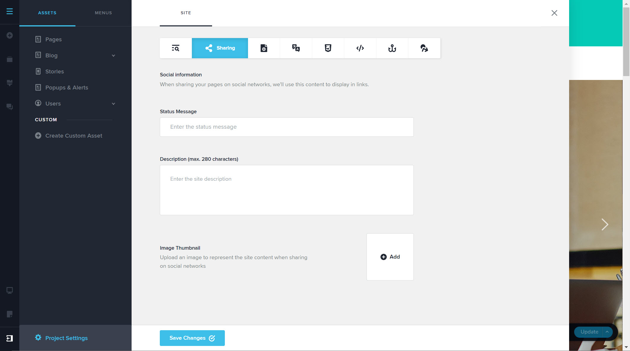 Sharing (공유) 탭에서는 SNS 공유 시 표시되는 제목과 설명, 썸네일을 지정할 수 있습니다.