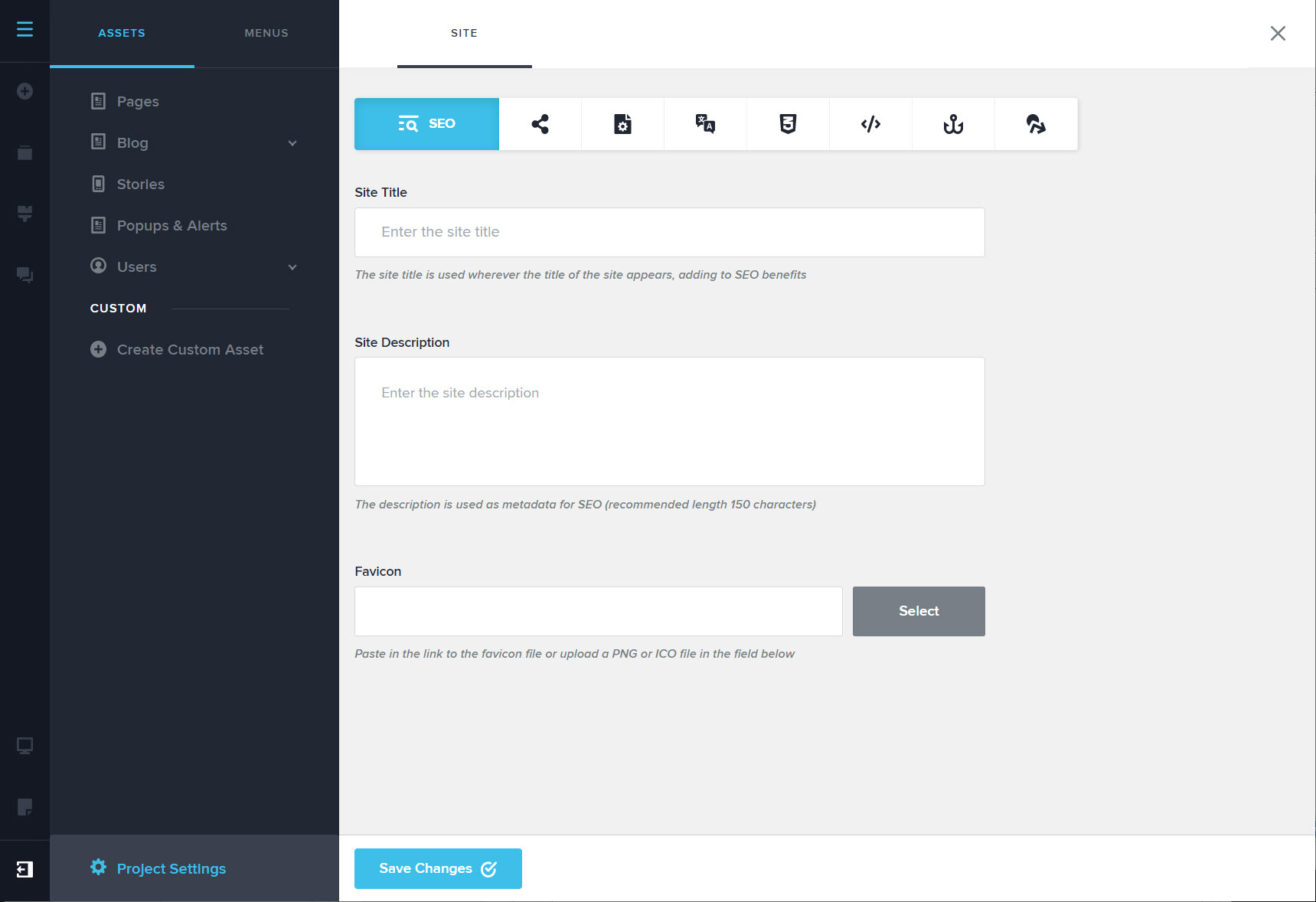 SEO에서 사이트 제목과 사이트 설명을 입력할 수 있고, 파비콘을 추가할 수 있습니다.