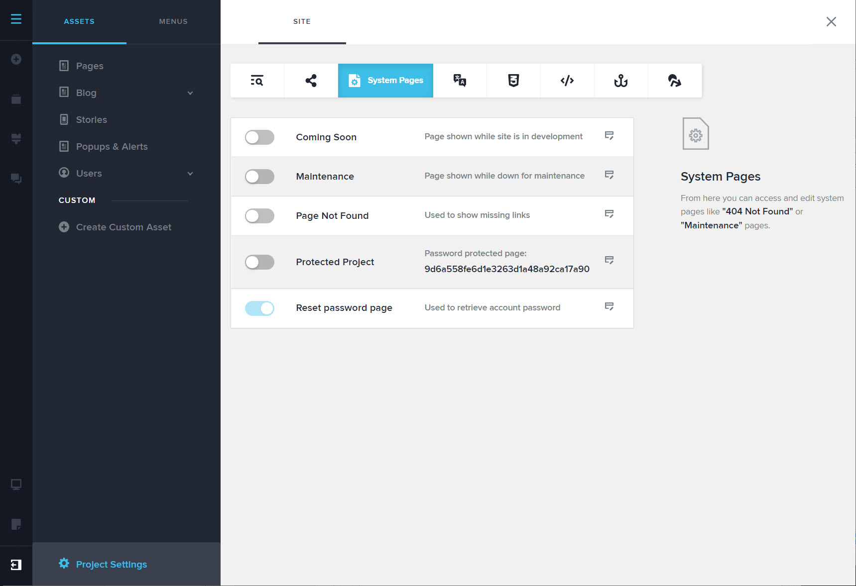 System Pages에서는 "404 Not Found" 또는 "Maintenance" 페이지와 같은 시스템 페이지에 액세스하여 편집할 수 있습니다.