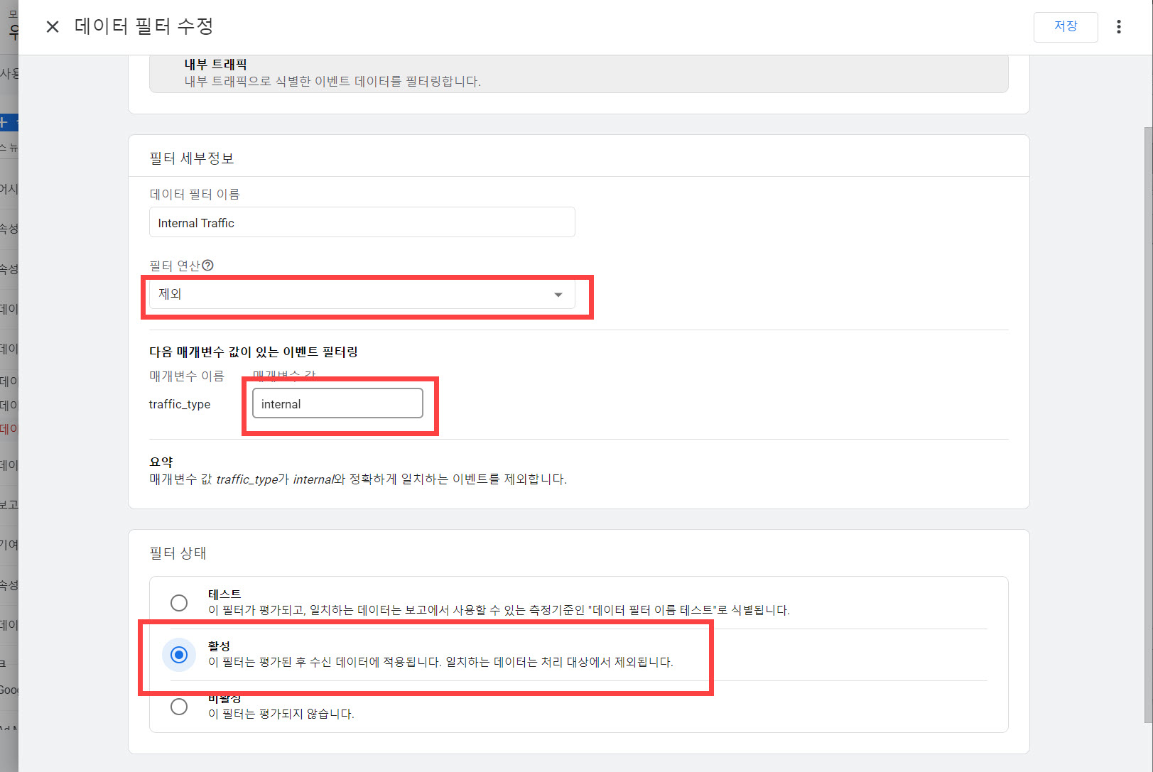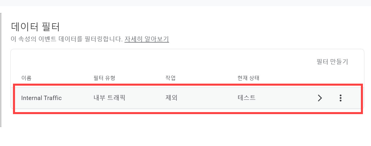 2. 데이터 필터 화면에서 "필터 만들기" 버튼을 클릭하여 내부 트래픽 필터를 만들거나, 기본적으로 생성되어 있는 테스트 상태의 필터를 선택하여 수정할 수 있습니다.