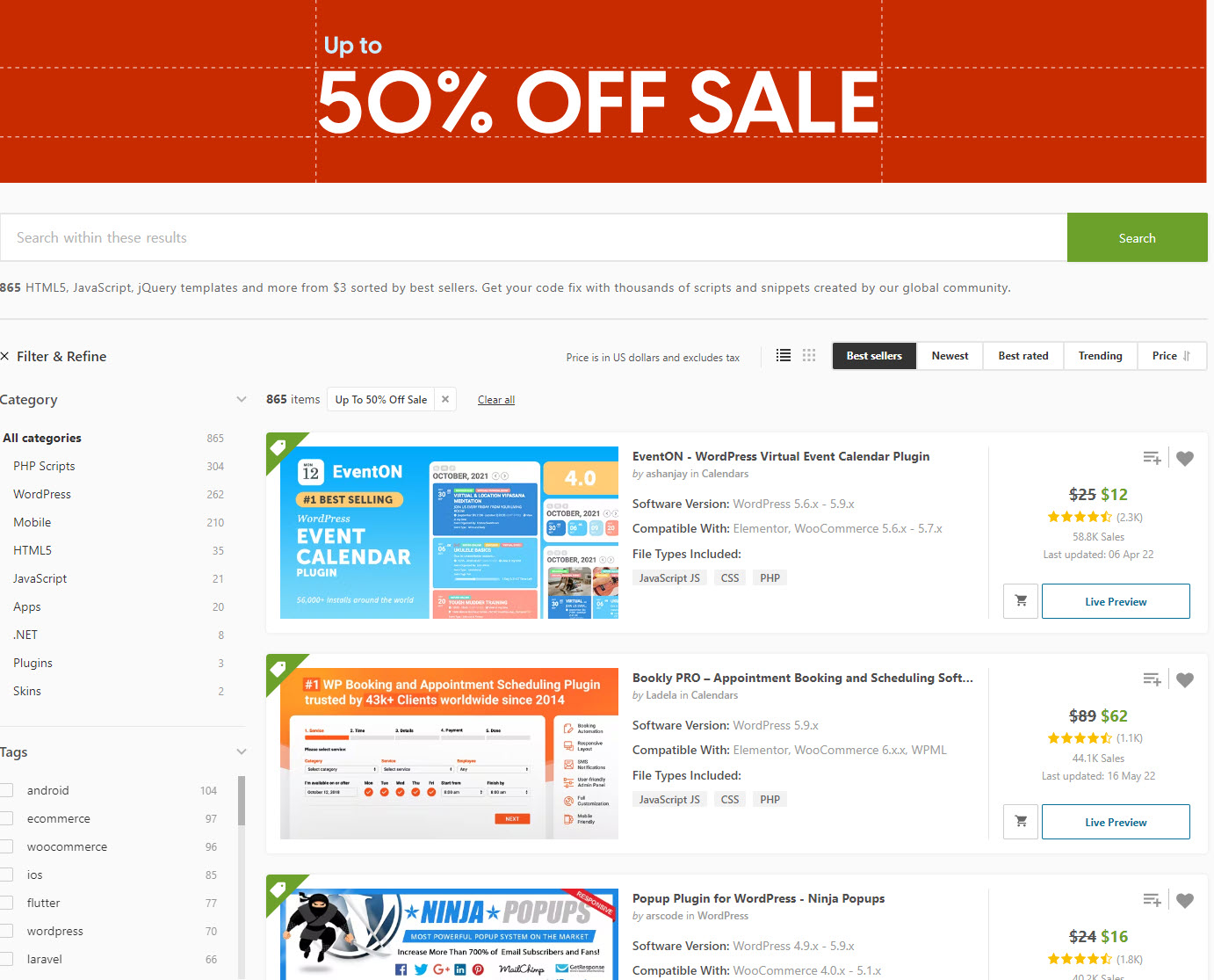 Themeforest 마켓에서 일부 워드프레스 테마와 플러그인을 한시적으로 최대 50% 할인 판매하는 행사를 진행하고 있습니다. 워드프레스 테마로는 Jupiter, Salient, TheGem, Porto, Eduma, Oshine, Stockholm, REHub, MyListing, JNews, SmartMag, Travel Booking WordPress Theme, Pluto, Minimog 등을 비롯한 다수의 테마를 저렴하게 구입할 수 있습니다.