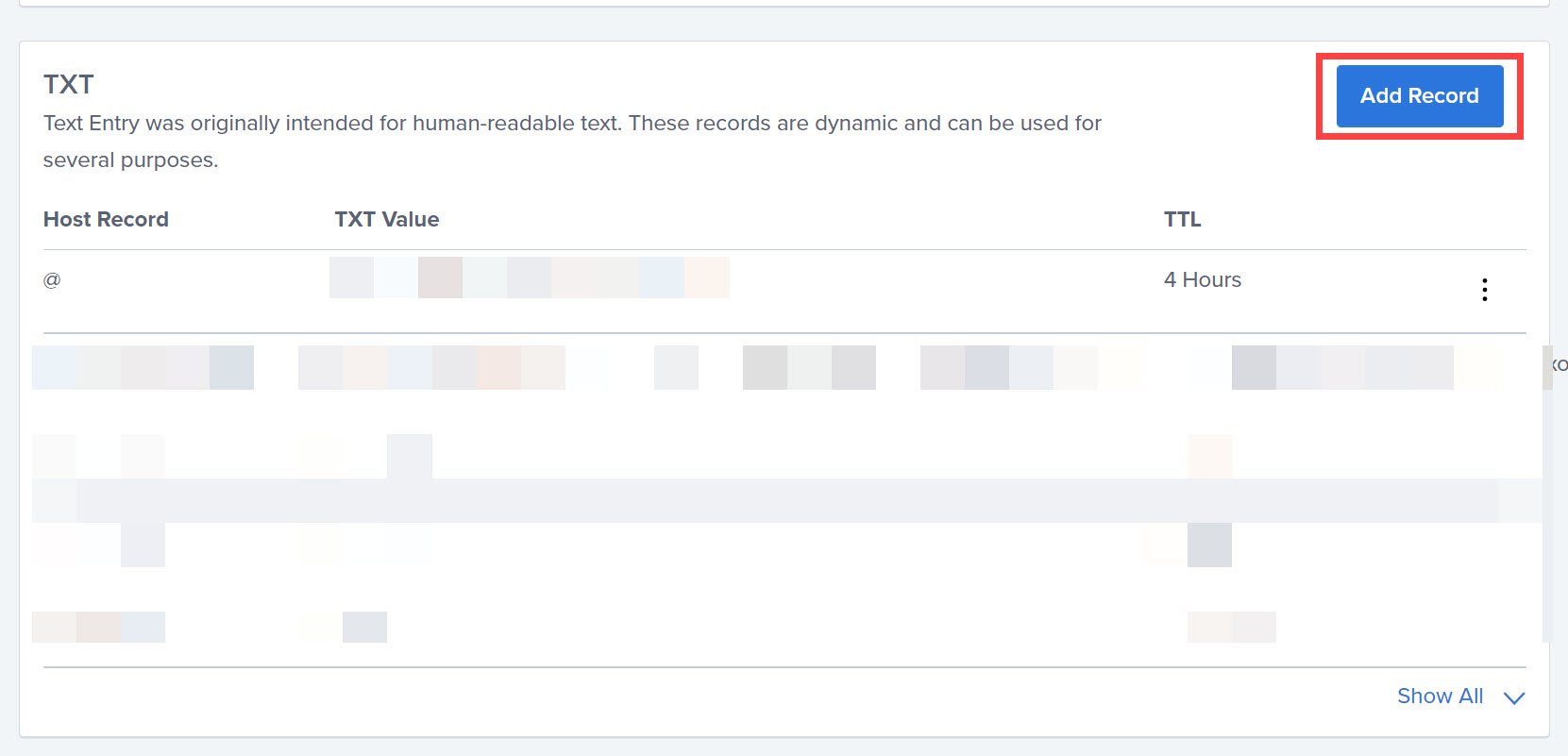 TXT 레코드로 추가하고 싶은 경우 마찬가지로 TXT 섹션으로 이동하여 Add Record 버튼을 클릭하도록 합니다.