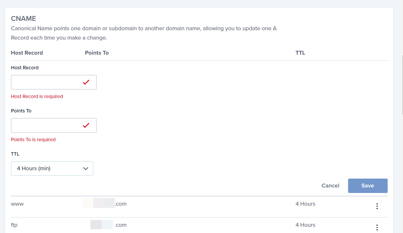 CNAME 레코드를 추가하기 위해 CNAME 섹션에서 Add Record 버튼을 클릭하면 CNAME 레코드를 추가할 수 있는 필드가 표시됩니다.