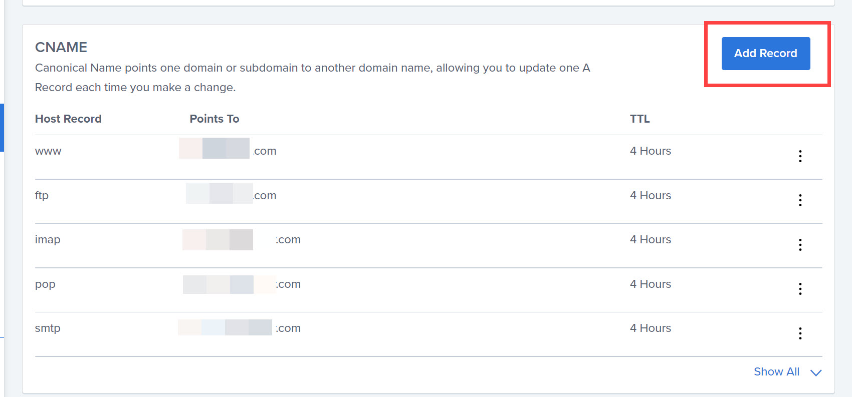 CNAME 섹션으로 스크롤하여 Add Record 버튼을 클릭합니다.