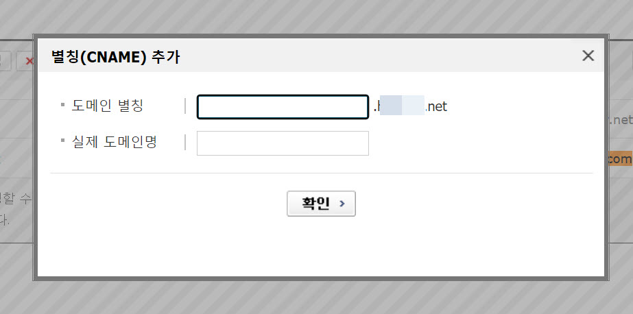 별칭(CNAME) 추가 팝업이 표시되면 구글 워크스페이스에 제시된 정보를 입력하고 확인 버튼을 클릭하면 됩니다.