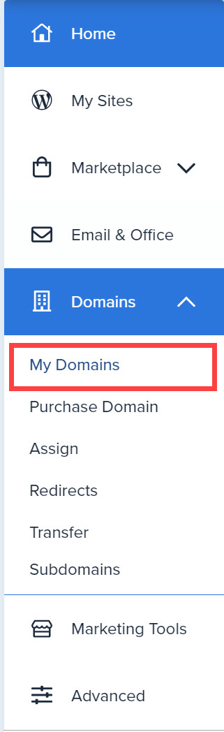 도메인이 해외호스팅 중 하나인 블루호스트(Bluehost)에 연결되어 사용되고 있는 경우에는 블루호스트에 로그인한 다음, Domains > My Domains를 클릭합니다.