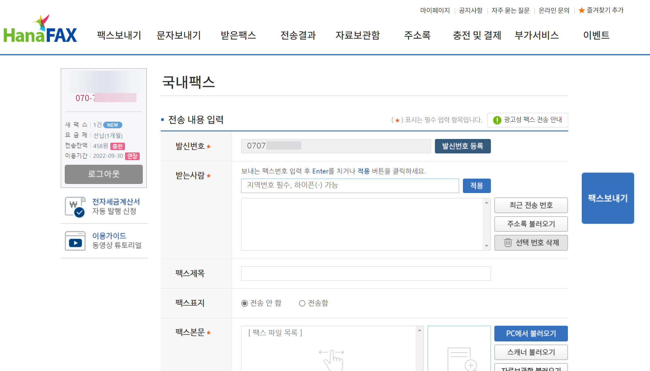 국내 번호로의 팩스 전송료는 건당 42원입니다. 가입 시 500원이 충전되므로 여러 번 발송이 가능합니다.