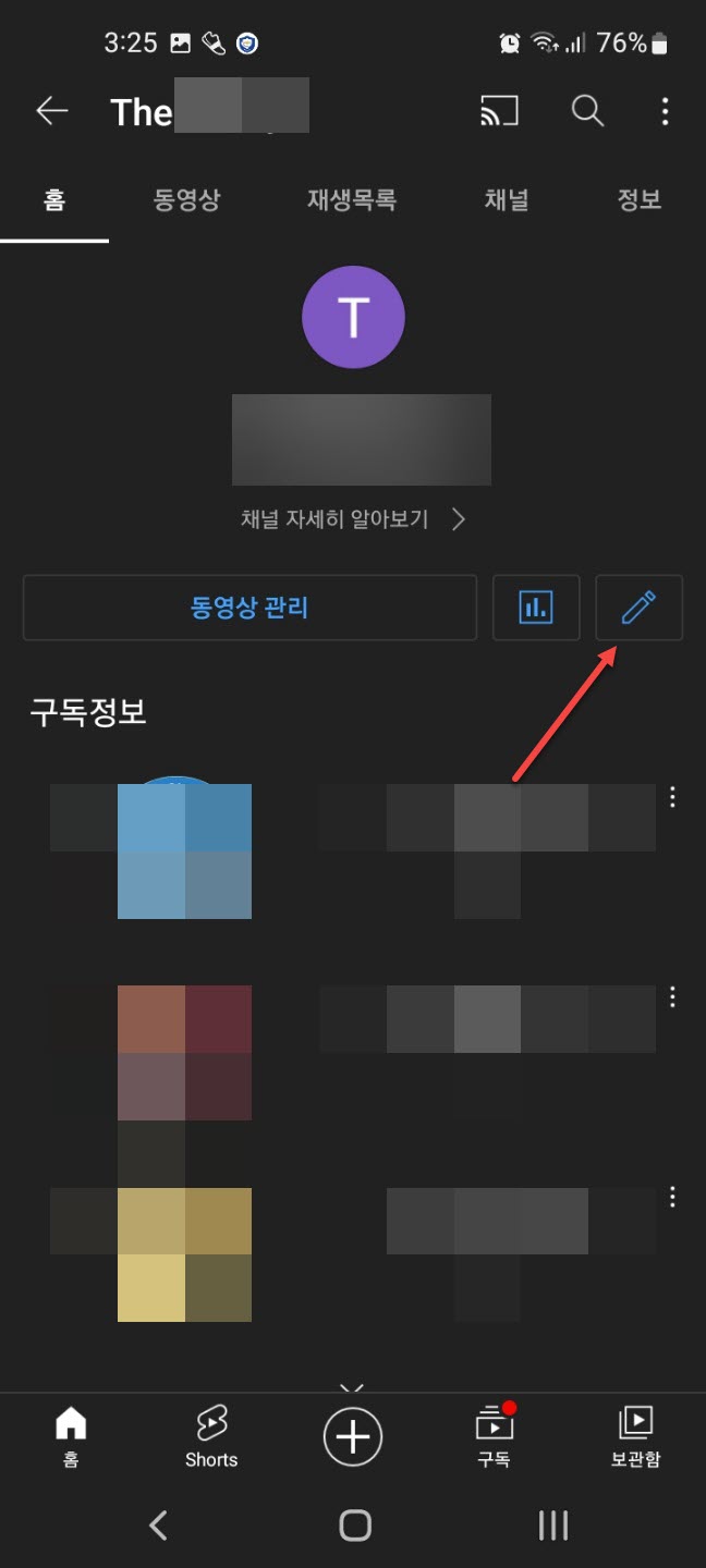 아래와 같은 내 채널 화면이 표시되면 동영상 관리 오른쪽의 편집 아이콘(연필 모양 아이콘)을 클릭합니다.