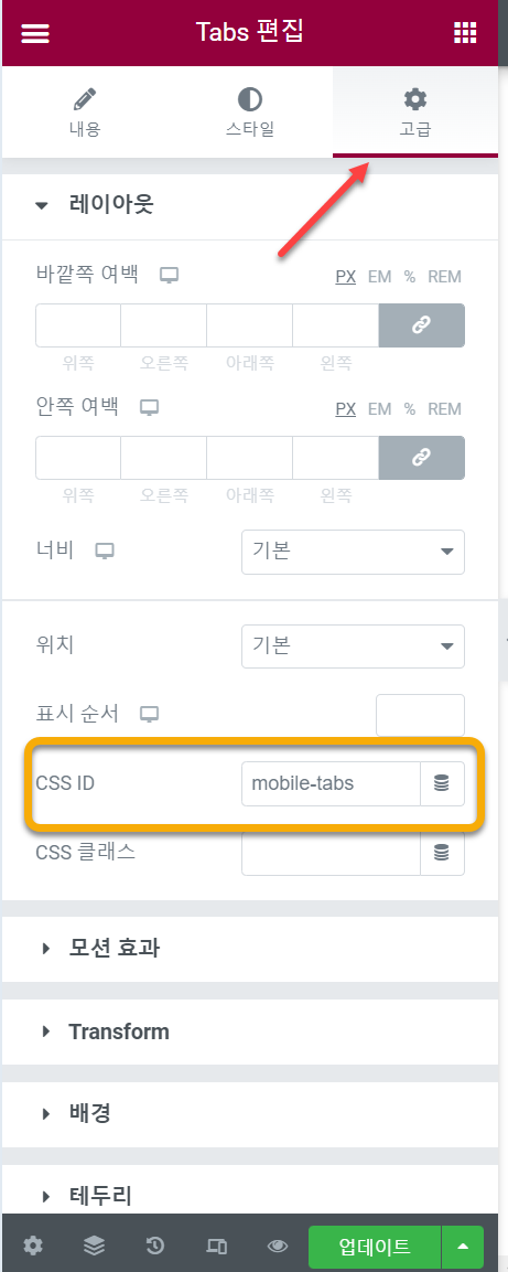 1. 먼저 Tabs 편집 패널에서 고급(Advanced) 탭을 클릭한 다음, CSS ID 필드에 [**mobile-tabs**]를 입력합니다.