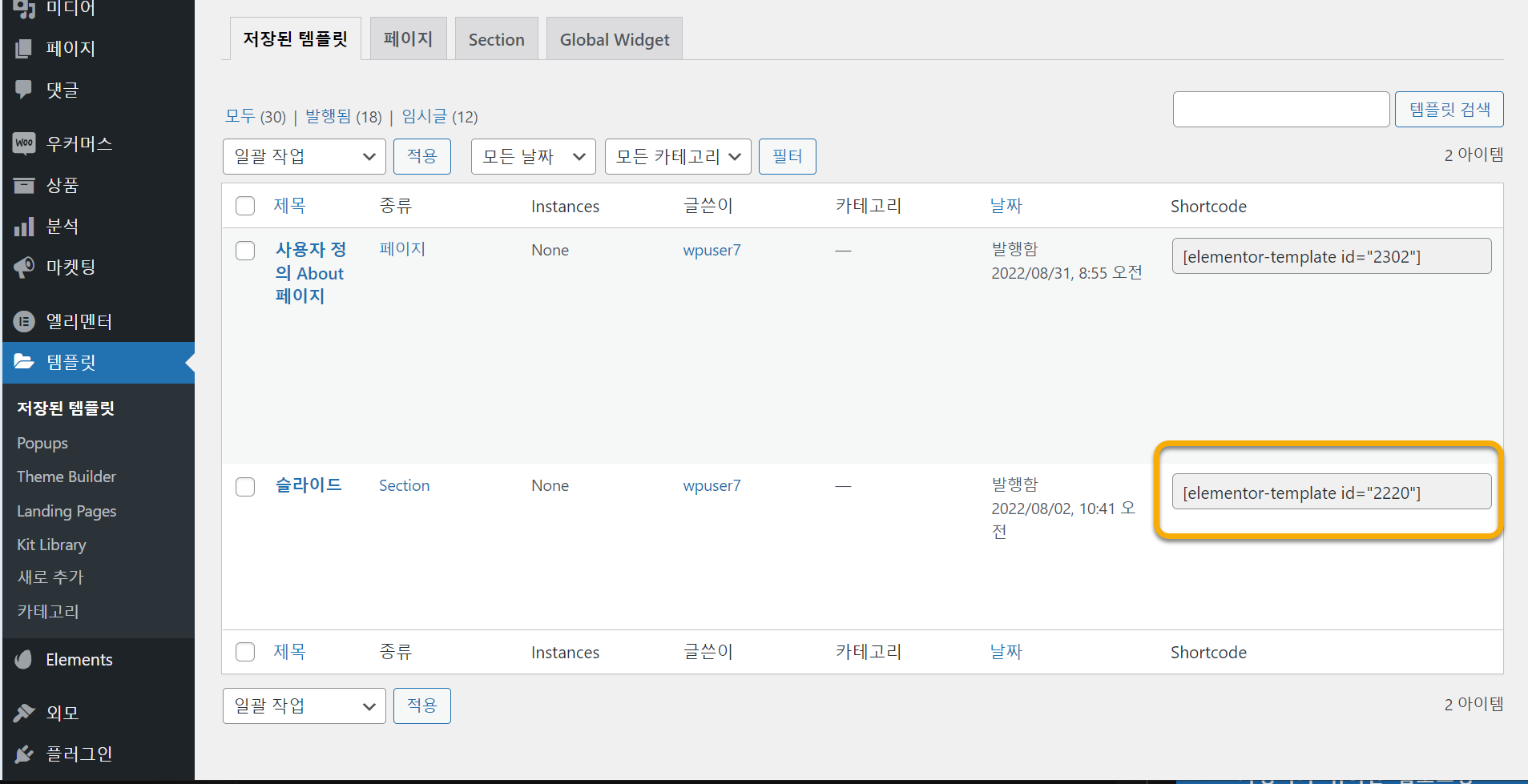 워드프레스 알림판 » 템플릿 » 저장된 템플릿에서 템플릿의 숏코드(Shorcode)를 복사하도록 합니다.