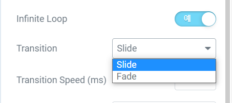 기본적으로 Slide가 선택되어 있습니다. 일반적인 슬라이드인 경우 Slide를 그대로 두면 됩니다. Fade를 선택하면 슬라이드가 좌우로 이동하지 않고 슬라이드가 어두워졌다가 밝아지면서 다음 슬라이드가 표시됩니다.