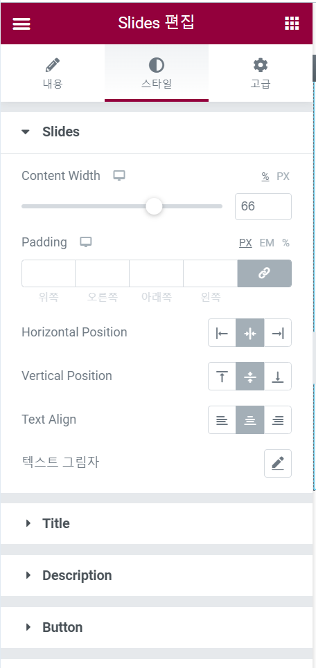 Title, Description, Button 등의 섹션에서 슬라이드 제목, 설명, 버튼의 스타일을 세부적으로 지정할 수 있습니다.
