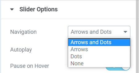 내비게이션은 기본적으로 화살표와 점이 표시됩니다. Navigation 옆의 드롭다운을 클릭하여 Arrows and Dots, Arrows, Dots, None 중에서 선택할 수 있습니다.