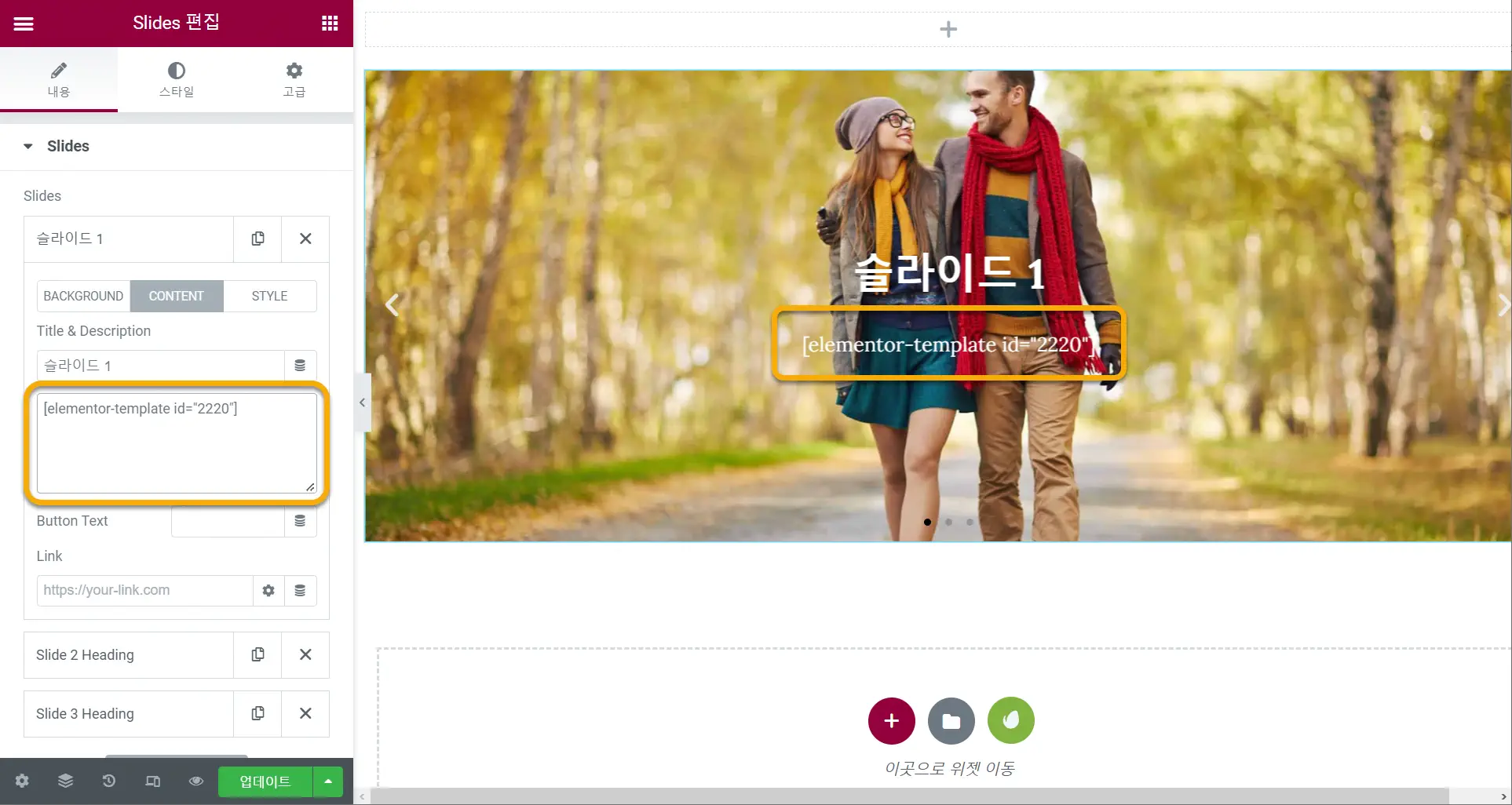 추가적인 콘텐츠를 추가하고 싶거나 버튼을 여러 개 표시하고 싶은 경우 아래의 "슬라이드에 추가적인 콘텐츠 입력하기" 부분을 참고하시기 바랍니다.