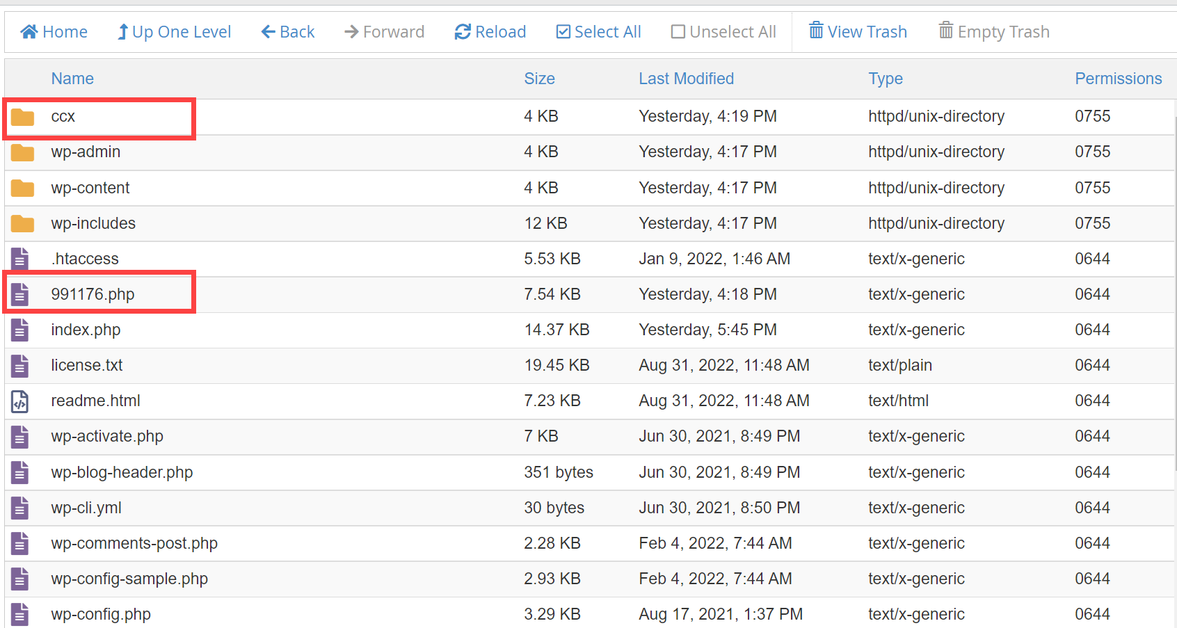 FTP를 통해 웹 서버에 접속해보니 거의 모든 폴더에 991176.php라는 파일과 ccx 폴더가 생성되어 있었습니다.