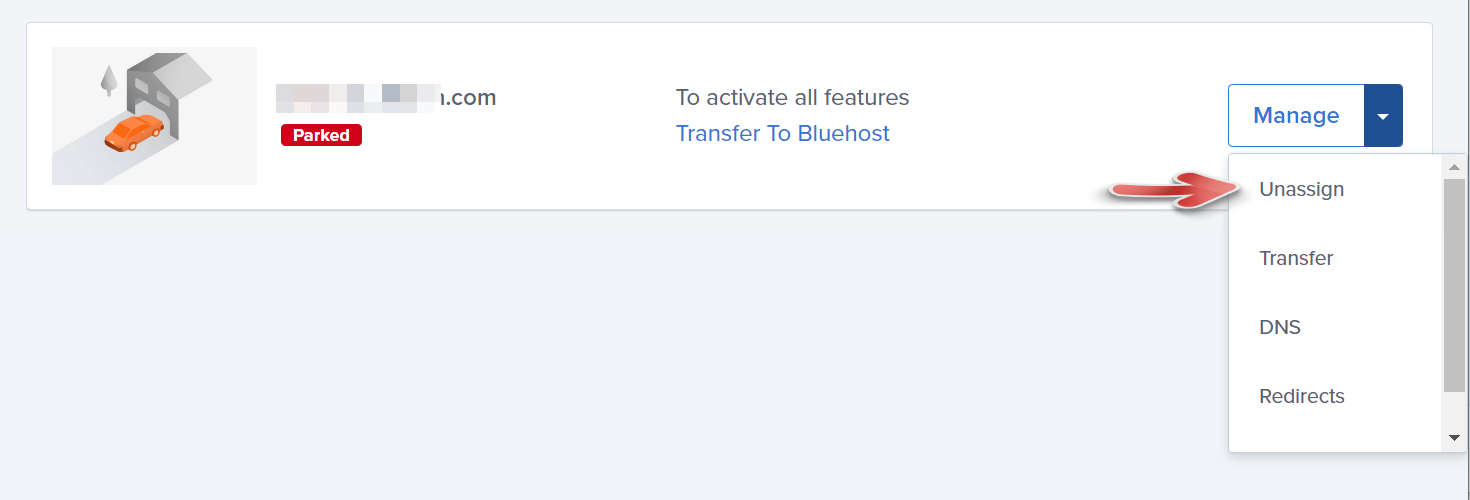 파킹을 해제할 도메인의 오른쪽에 있는 Manage 드롭다운를 클릭합니다.