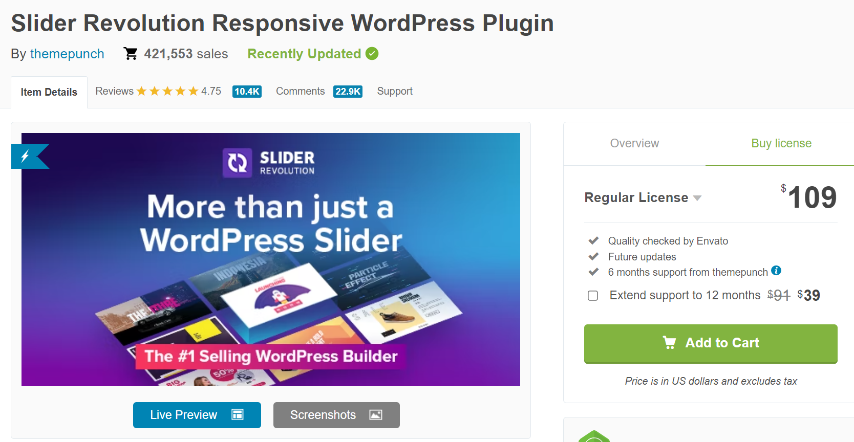 이 슬라이더 플러그인은 109달러로 다소 비싼 편입니다. 하지만 아바다(Avada) 테마 등 일부 유료 테마에 Slider Revolution이 번들로 탑재되기도 합니다. 프리미엄 워드프레스 테마에 탑재된 슬라이더 레볼루션의 라이선스는 테마 개발자에게 있으므로 지원과 업데이트를 플러그인 판매자로부터 받을 수 있습니다. 업데이트는 해당 프러그인이 종속된 테마를 통해 이루어집니다.