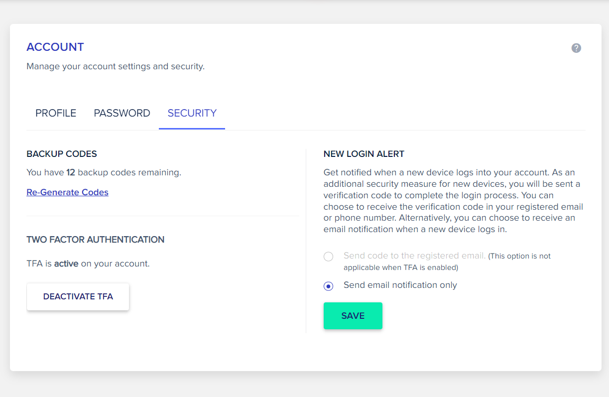 Security(보안) 탭에서 TWO FACTOR AUTHENTICATION(TFA: 2단계 인증)을 활성화할 수 있습니다.