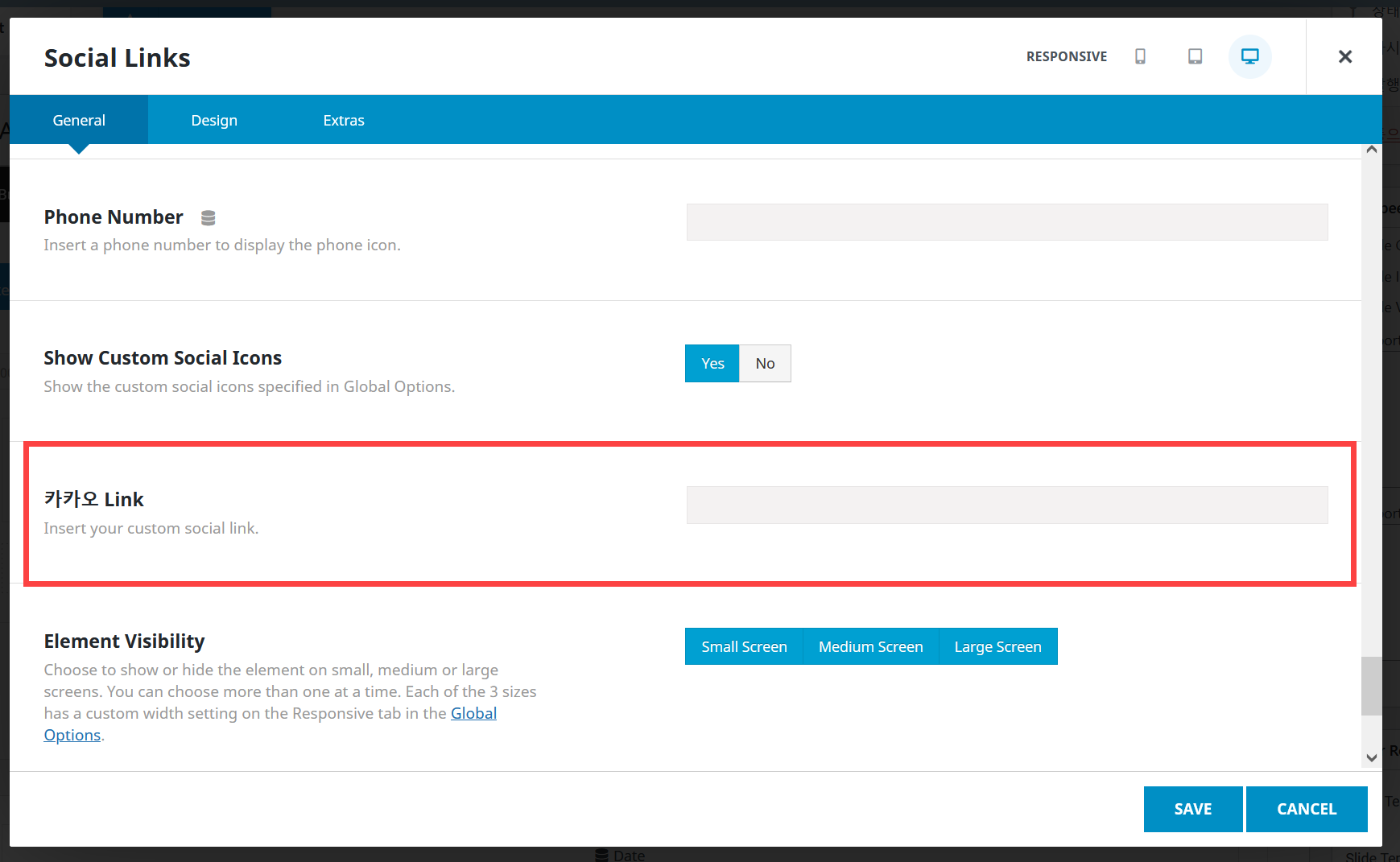 그러면 아래 그림과 같이 카카오톡 등 커스텀 소셜 미디어 링크를 추가할 수 있습니다.