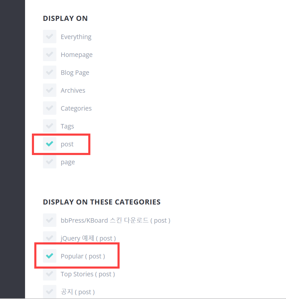 또한, 팝업이 표시되는 대상을 지정할 수 있습니다. Everything을 선택하면 사이트의 모든 글/페이지에 팝업이 표시됩니다. 특정 카테고리의 글에만 팝업이 표시되도록 할 수 있습니다.