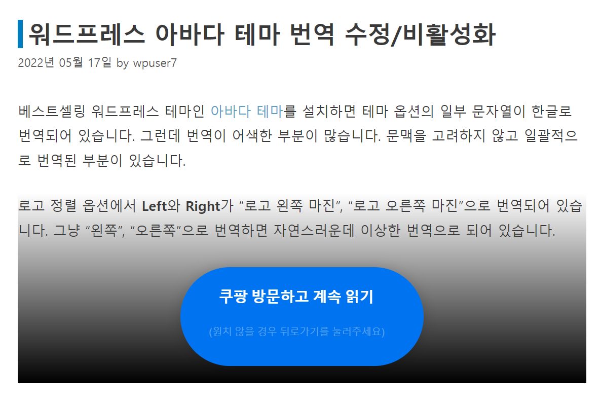 저는 워드프레스 인기 테마인 Divi 테마와 함께 제공되는 Bloom이라는 뉴스레터 가입 플러그인을 사용하여 워드프레스 사이트의 일부 글에서 다음 그림과 같이 글을 읽으려면 쿠팡 배너를 클릭하도록 유도하는 팝업을 표시하여 테스트해보았습니다.