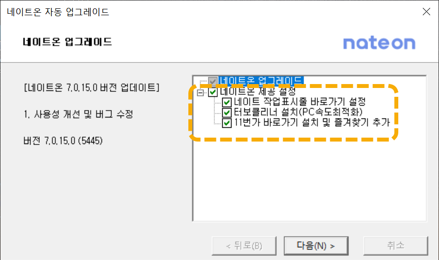 네이트온 업그레이드 시에도 "네이트온 제공 설정"은 모두 비활성화하는 것이 바람직합니다.