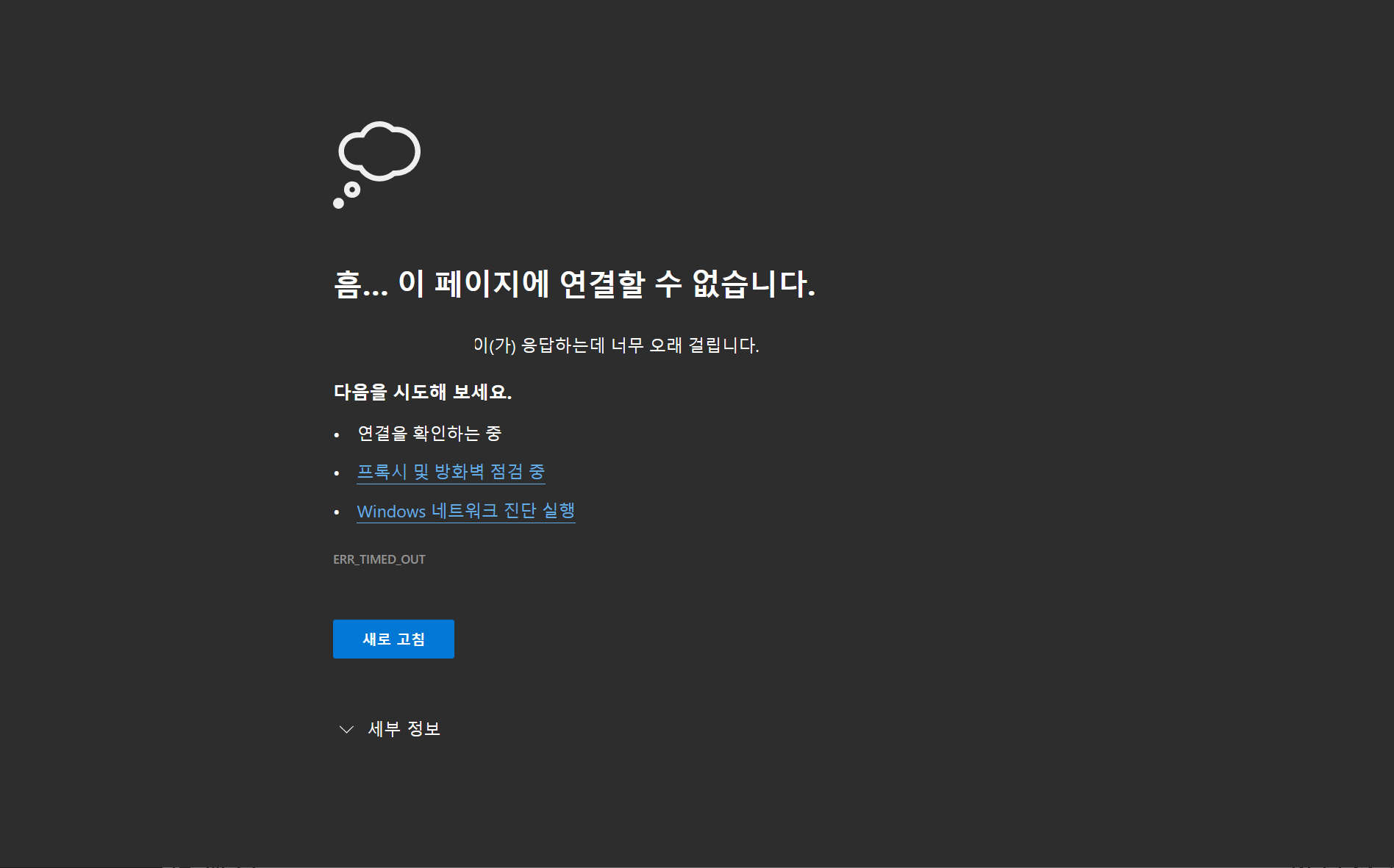 크롬에서는 위의 그림과 같이 ERR_CONNECTION_TIMED_OUT 오류가 발생하였고, 마이크로소프트 엣지 브라우저에서는 ERR_TIMED_OUT 오류가 발생했습니다.