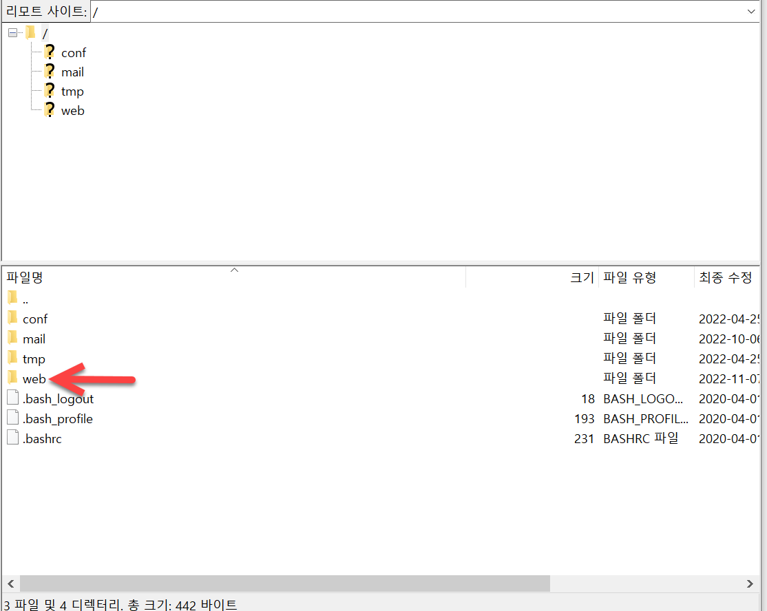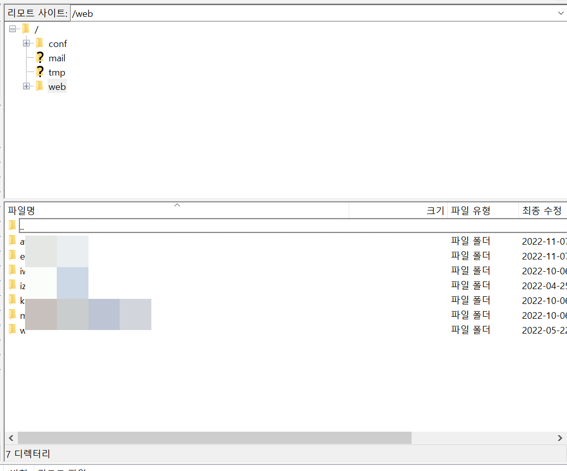 연결 버튼을 클릭하여 FTP 서버에 접속하면 다음과 같은 폴더 화면이 표시됩니다.