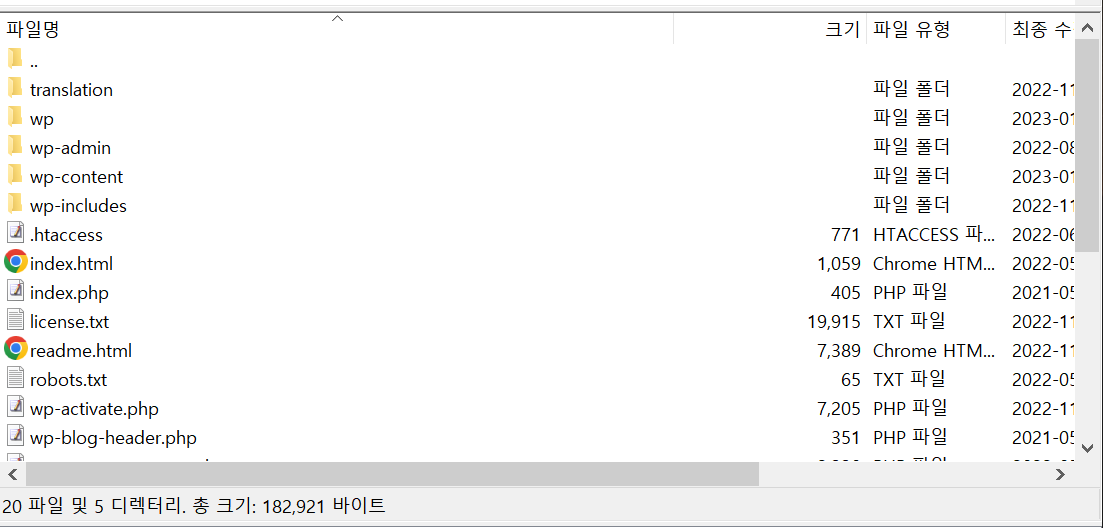 워드프레스가 설치되어 있다면 다음과 비슷한 폴더(예: wp-content)와 파일들이 표시될 것입니다.