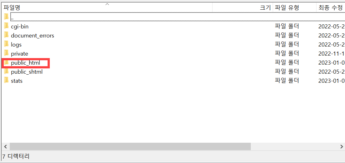 [**public_html**] 폴더를 클릭하면 해당 사이트의 루트 폴더로 이동하게 됩니다.