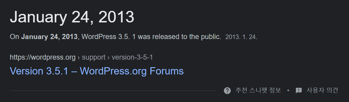 사이트의 워드프레스 버전이 3.5.1이었습니다. 워드프레스 3.5.1 버전은 2013년 1월 24일에 공개되었습니다. 10년 동안 한 번도 업데이트하지 않고 이용하고 있었던 것입니다.😥😥😥