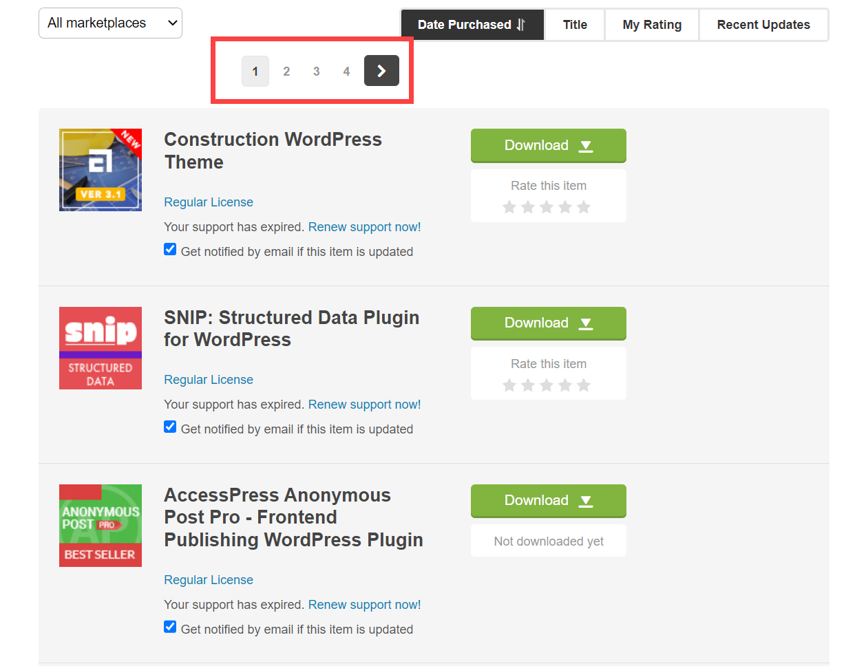엔바토 마켓(테마포레스트와 코드캐년을 포함하는 상위 마켓)에서만 구입한 테마와 플러그인을 체크해보니 60개가 넘네요.😄😄😄 (아래 그림에서 한 페이지에 20개 항목이 표시됨.)