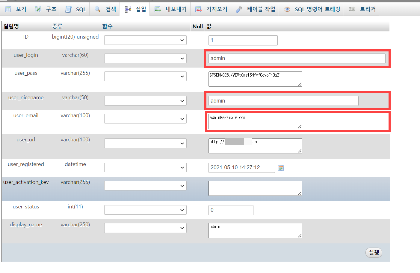 관리자 아이디(user_login), 관리자 닉네임(user_nickname), 그리고 관리자 이메일 주소(user_email)를 적절히 변경합니다.