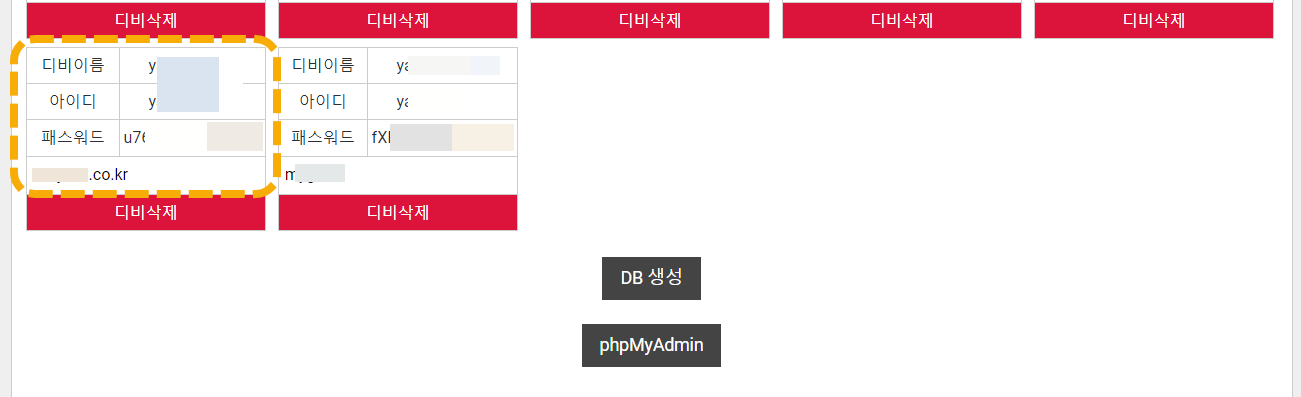 phpMyAdmin에 접속하기 위해서는 DB 사용자 이름과 비밀번호를 알아야 합니다. 위의 그림에서 디비 아이디와 디비 패스워드를 사용하여 phpMyAdmin에 로그인할 수 있습니다.