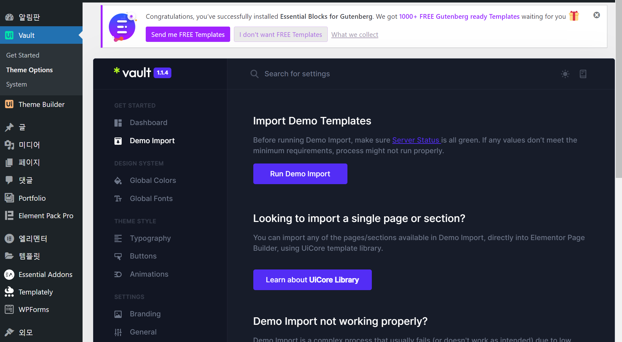 Vault라는 다목적 엘리멘터 워드프레스 테마를 설치하고 Vault » Theme Options » Demo Import를 방문했을 때 위의 그림과 같은 에러가 발생하는 문제를 최근 접했습니다.