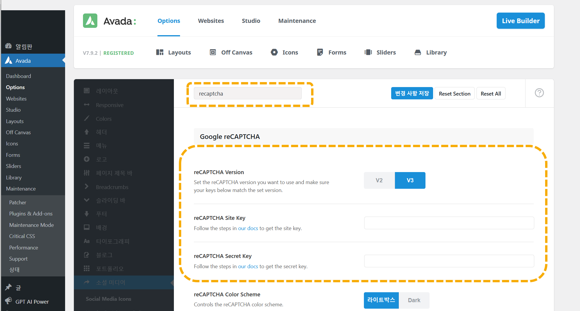 Avada » Options에서 recaptcha로 검색하여 Google reCAPTCHA 설정 필드에 reCAPTCHA 사이트 키와 reCAPTCHA 시크릿 키를 입력해야 합니다.